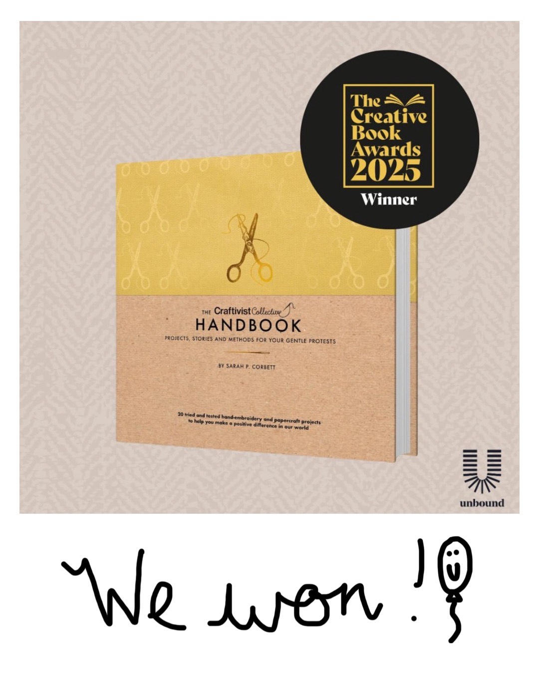 Sarah P Corbett's most recent book The Craftivist Collective Handbook has won Best Mixed Media Craft Book in The Creative Book Awards 2025! The Creative Book Awards celebrate the best crafty and design books in the industry. Great British Sewing Bee star Stuart Hillard, as a judge wrote: “There is nothing ‘shouty’ about this book... instead [it] invites everyone to explore crafts and activism at the same time... The world needs more books like this!”. You can order signed copies here.
