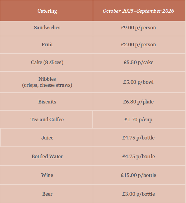 The Guild can provide simple catering for your event, with a delicious selection of drinks, snacks and light lunches. Please contact roomhire@artworkersguild.org for more information, and see the tariff below for pricing.