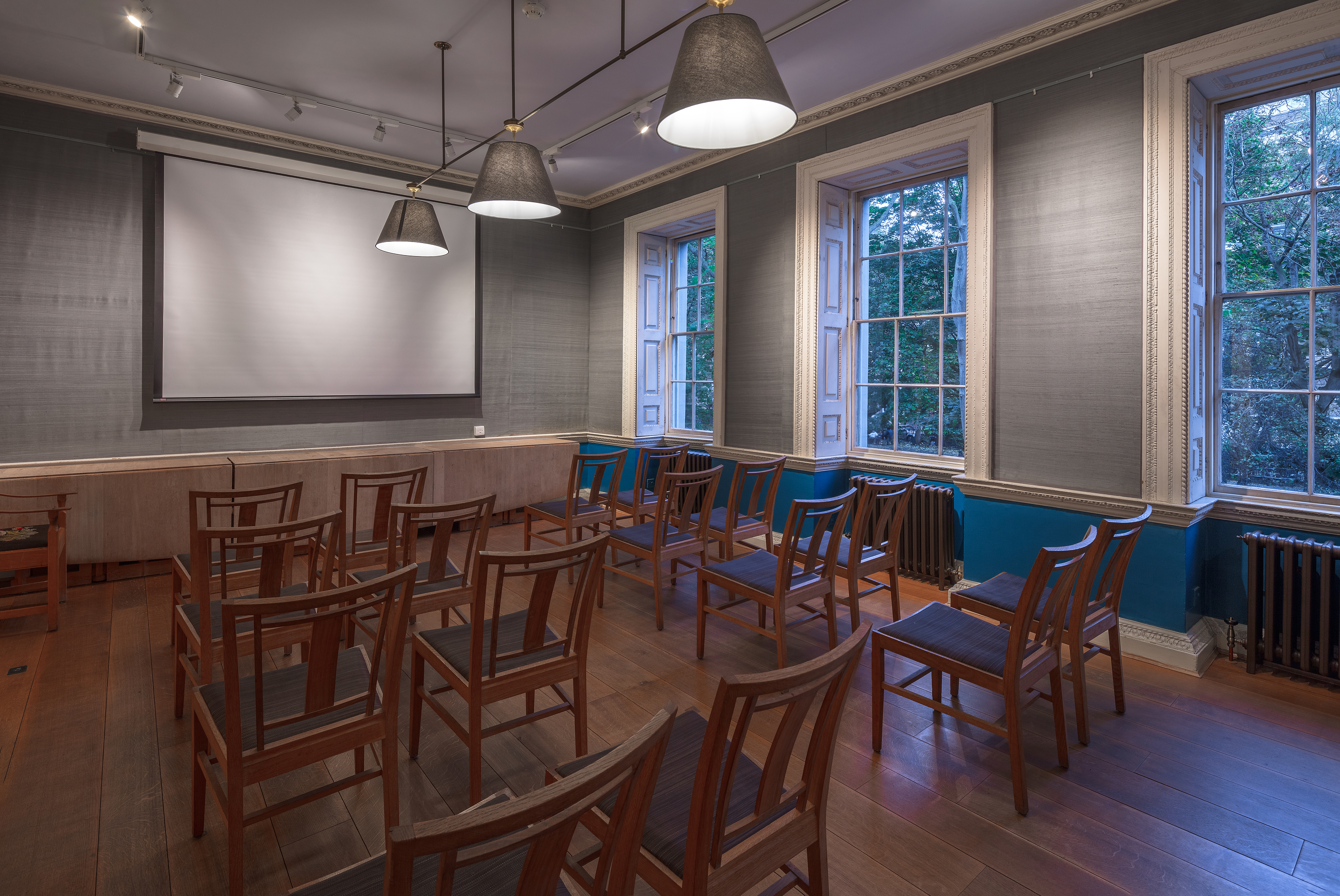 This Georgian reception room on the first floor serves as a committee or presentation room, and can also be used as an excellent exhibition space, holding 70 people at a private view. The Gradidge Room overlooks the leafy square and there is a break-out space in the adjoining library.