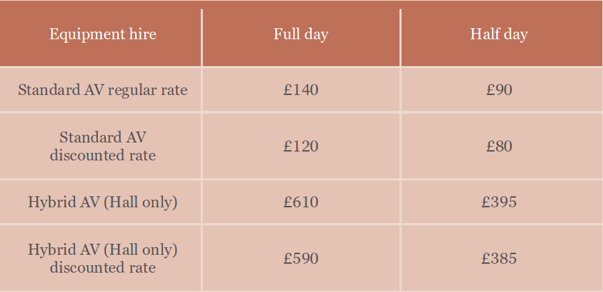 We provide AV facilities, including a projector, screen, laptop, microphones and remote controls in the hall. Hirers may use these facilities for an extra charge.