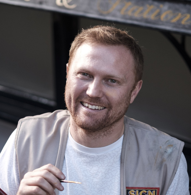 Jack Hollands is a traditional sign writer with a passion for lettering, he specialises in traditional freehand sign writing and glass gilded signage. He has mentored sign writing apprentices, passing on the skills of the craft. Hollands is also a keen photographer who documents British lettering throughout London on Instagram.