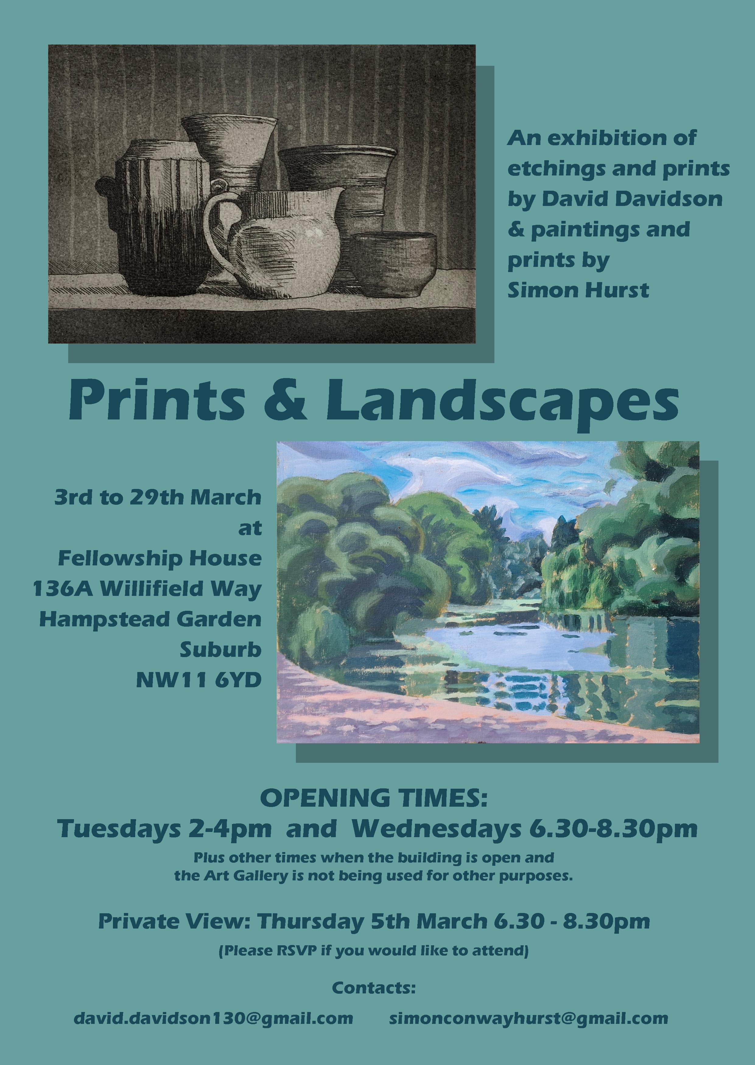 Simon Hurst is exhibiting paintings and prints at Fellowship House until Sunday 29 March. The exhibition is open on Tuesdays from 2 - 4pm and Wednesdays from 6.30 - 8.30pm.
